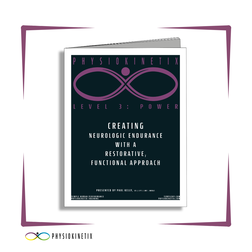 Paul Kelly’s Level 3- “Creating Neurologic and Cardiorespiratory Endurance while Strengthening the Motor Cortex” workbook, is designed to help clinicians and clients learn Level 3- Power corrective techniques in an easy to follow workbook format. Learn how to perform our corrective techniques, corrective movements, and neurological modifiers in each level with ease. Use the techniques in our system to build proper cross patterning into your body and help teach your brain a more effective, and injury free way, to get back into fitness. Utilize our quick fix guide in the front of the workbook to correct your specific chronic pain and neurologic dysfunction issues, while creating a home self-care routine you can always use to alleviate your specific pain pattern issues (Neck, Back, Shoulder, Leg, ect).